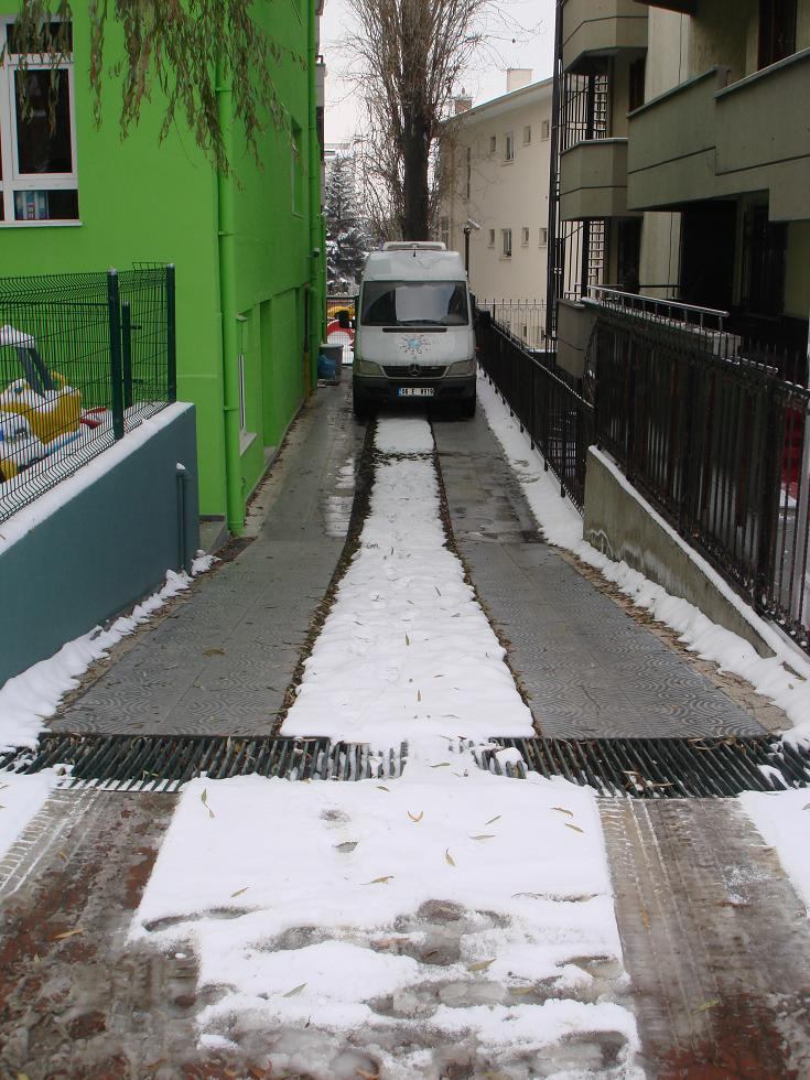 Öğrenci taşıyan servislerin güvenliğini sağlamak öncelikli istenen uygulamalardandır. Bu amaçla yapılan okul rampa ısıtması, uygulama alanına önce 3 cm kalınlığında XPS ısı yalıtım levhaları döşenmesi sonra da ısıtma kabloları, çelik hasır yöntemi ile sabitlenmesi suretiyle gerçekleştirilmiştir. Sistem kar ve buz oluşumunu takip edebilen